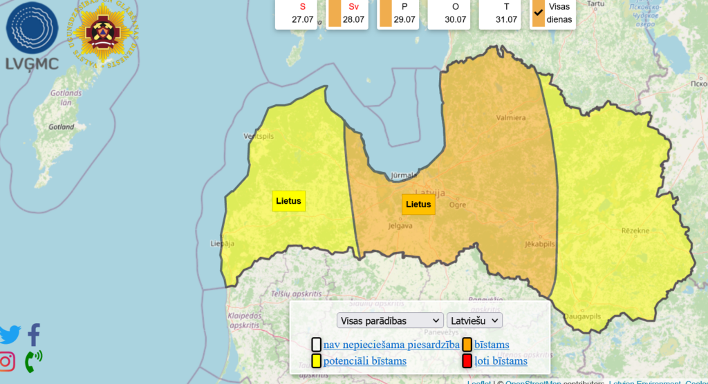 Svētdien gaidāmā stiprā lietus un pērkona negaisa dēļ Latvijas vides, ģeoloģijas un meteoroloģijas centrs (LVĢMC) izsludinājis oranžo brīdinājumu.