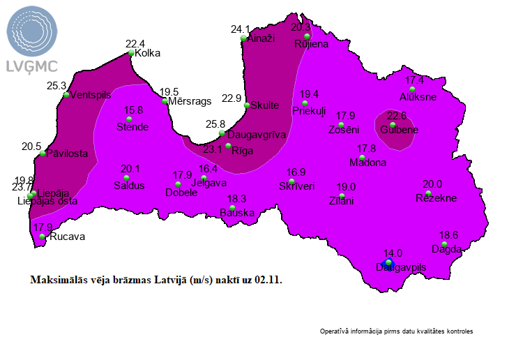 Svētdien saglabāsies mēreni stiprs ziemeļrietumu, rietumu vējš, brāzmās 15-19 metri sekundē, taču piekrastes rajonos vējš brāzmās var sasniegt arī 20-23 metrus sekundē.