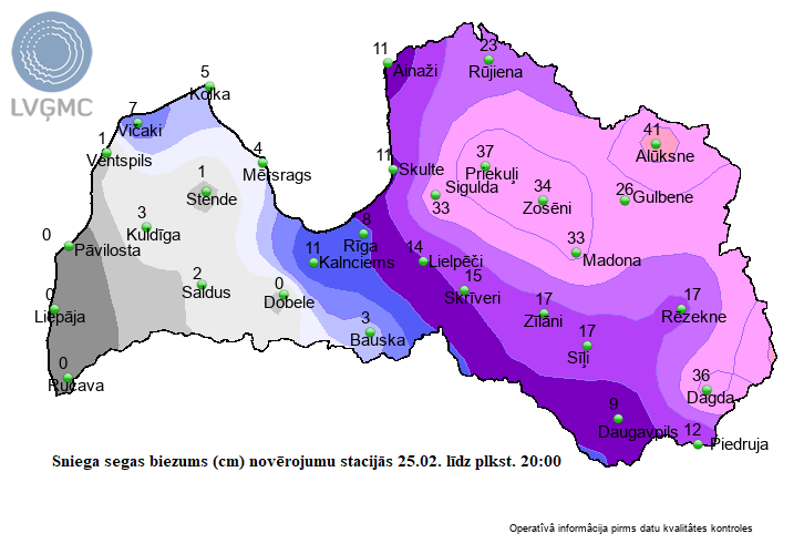 Lielā daļā Kurzemes un Zemgales ir mazāk nekā pieci centimetri sniega, savukārt Vidzemes un Latgales lielāko daļu sedz vairāk nekā 20 centimetrus bieza sniega kārta. Dziļākais sniegs novērojumu stacijās ir 30-33 centimetri Siguldā, Priekuļos, Zosēnos un Madonā, kā arī 37 centimetri Alūksnē un 40 centimetri Dagdā, turklāt vairākās novērojumu stacijās sniega sega pēdējās stundās sarukusi vēja ietekmē.