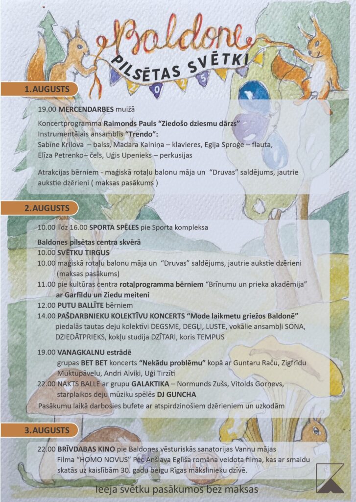 Svētdien, 3.augustā, plānots svētku noslēgums ar kino seansu svaigā gaisā. Plkst.22 pie Baldones vēsturiskās sanatorijas Vannu mājas plānots brīvdabas kino. Tiks demonstrēta filma “Homo novus”, kas veidota pēc Anšlava Eglīša romāna motīviem.
