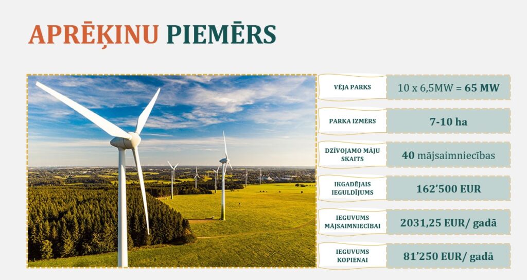 Klimata un enerģētikas ministrijā skaidro, ka ieguldījums vietējā kopienā attieksies kā uz vēja parkiem sauszemē, tā arī jūrā izvietotām vēja turbīnām, kuru jauda ir vismaz 1MW un vairāk. Ieguldījums vietējā kopienā tiks piemērots tajos gadījumos, kad vēja turbīnas sauszemē atradīsies 2 km attālumā no dzīvojamās ēkas, bet jūrā vēja parks atradīsies līdz 25 km attālumā no krasta (mērot no vēja parka robežas taisnā leņķī pret krastu un maksājumu piemērojot dzīvojamajām mājām 2 km rādiusā no krasta punkta). Gadījumā, ja vēja projekta attīstītājs plāno palielināt jaudu jau esošajai vēja elektrostacijai vai palielināt turbīnu skaitu jau esošā vēja parkā, arī tādā gadījumā projekta attīstītājam būs jāsniedz ieguldījums vietējai kopienai. Šobrīd pie pārvades sistēmas pieslēgti trīs vēja parki, kas atrodas Ventspils reģionā.