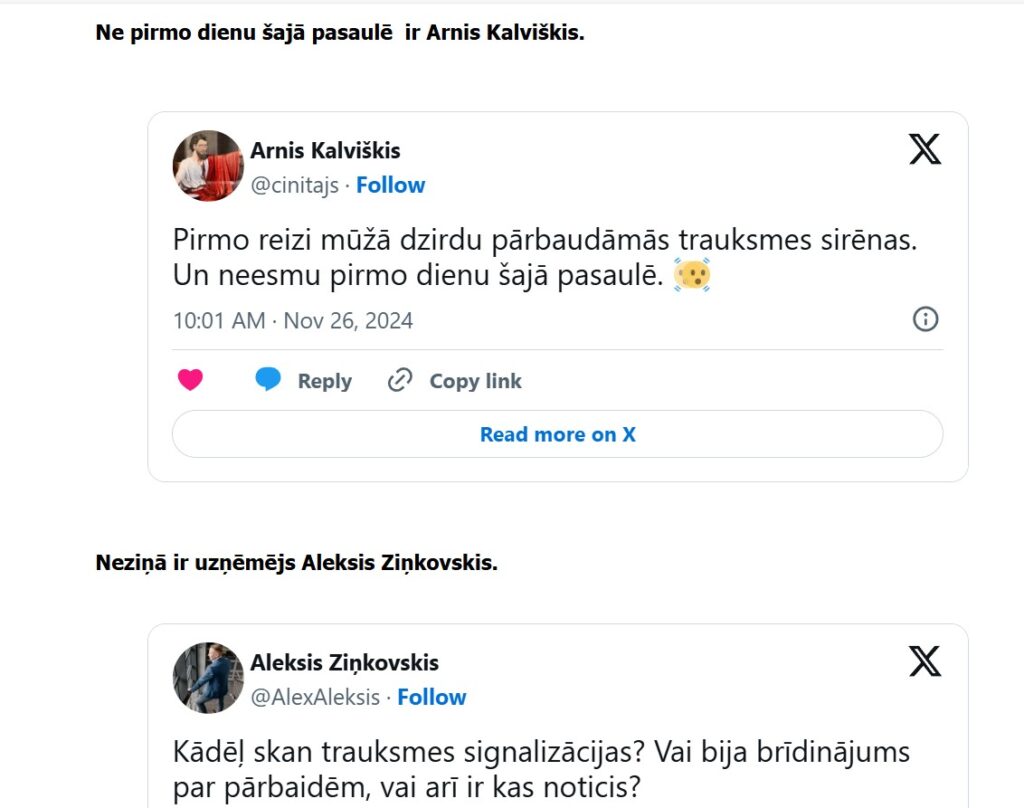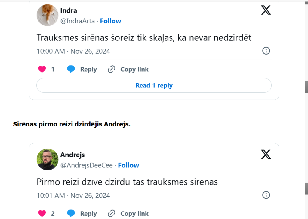 Daži sociālā tīkla “X” lietotāji šodien pirmo reizi dzīvē dzirdējuši sirēnas, citu trauksmes sirēnas pamodinājušas. Vēl kāds atklājis, ka speciāli izslēdzis radio un atvēris logu, lai tās dzirdētu.