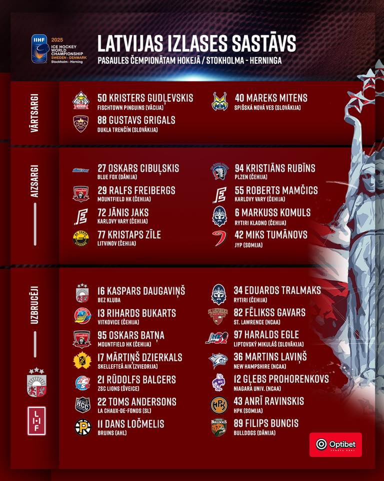 Latvijas hokeja izlases sastāvs dalībai 2025.gada pasaules čempionātā: