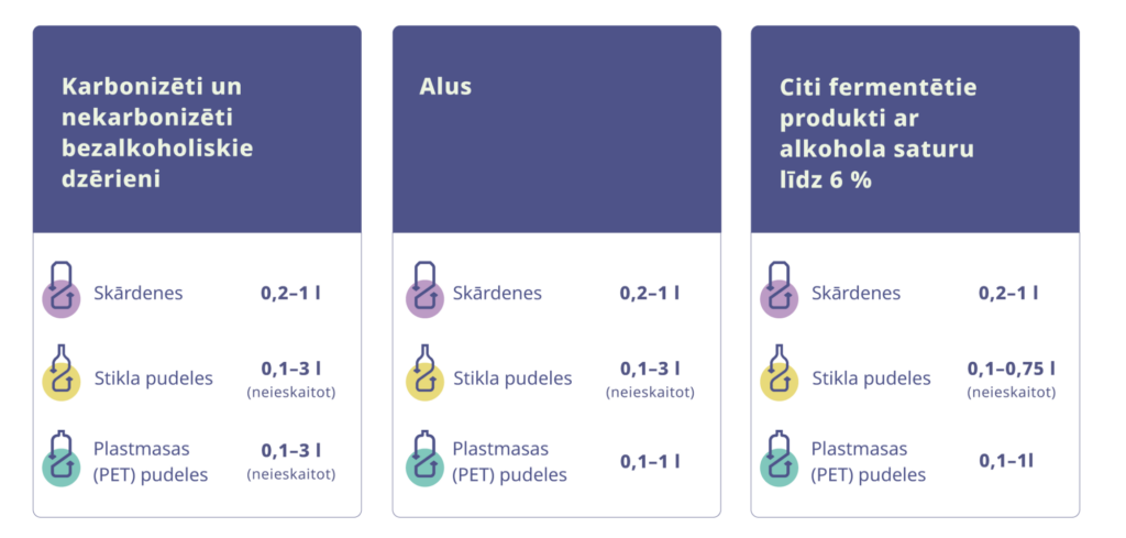 No 1. februāra depozīta sistēmā varēs nodot stikla, plastmasas (PET) un metāla (skārdenes) dzērienu iepakojumus. Šajos iepakojumos var būt iepildīti dažādi karbonizētie un nekarbonizētie bezalkoholiskie dzērieni (piemēram, minerālūdens, dzeramais ūdens, limonādes, enerģijas dzērieni, ledus tēja, sulas, nektāri), visa veida alus, kā arī citi fermentētie produkti ar alkohola saturu līdz 6 % (piemēram, sidrs, alkoholiskie kokteiļi ar alkohola saturu no 0,5 % līdz 6 %).