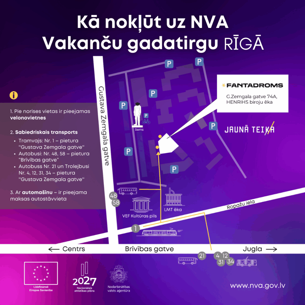 NVA skaidro, ka vakanču gadatirgus tiek organizēts Eiropas Sociālā fonda Plus projekta “Nodarbinātības valsts aģentūras veiktspējas stiprināšana” ietvaros.
