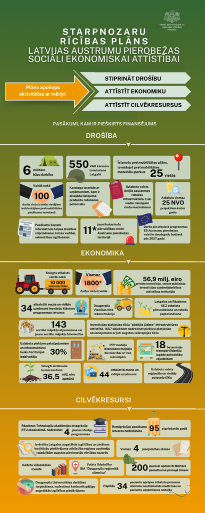 Drošības stiprināšanas jomā paredzēta infrastruktūras attīstības projektu īstenošana un dienestu reaģēšanas spēju stiprināšana, izbūvējot 11 jaunus katastrofas pārvaldīšanas centrus austrumu pierobežas teritorijā – Dagdā, Ilūkstē, Daugavpilī, Līvānos, Viļānos, Alūksnē, Preiļos, Balvos, Krāslavā, Ludzā un Rēzeknē.