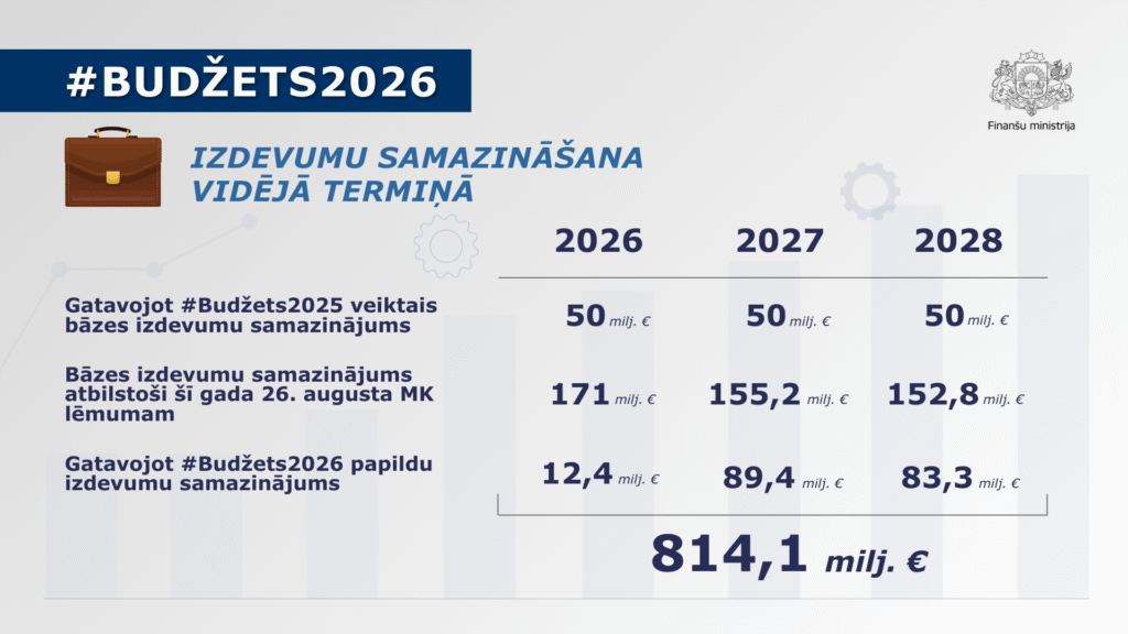 Jau gatavojot 2025. gada valsts budžetu, tika nolemts veikt bāzes izdevumu samazinājumu vidējam termiņam – 50 miljonu eiro apmērā ik gadu. Savukārt, strādājot pie 2026. gada budžeta, valsts budžeta izdevumu pārskatīšanas rezultātā nozaru ministrijas kopīgi identificēja un vienojās par izdevumu samazinājumu 171 miljona eiro apmērā, ko valdība apstiprināja šā gada 26. augustā. Turpinot darbu pie nākamā gada budžeta, nodrošināts vēl papildu 12,4 miljonu eiro izdevumu samazinājums.