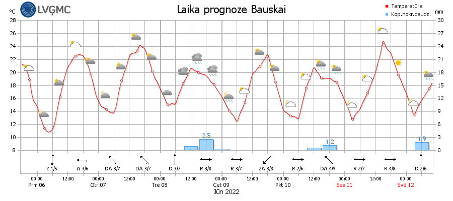 Rīgā mākoņi daļēji klās debesis, laiks būs sauss, pūtīs lēns ziemeļu vējš. Maksimālā gaisa temperatūra no +17 grādiem pilsētas ziemeļos līdz +22 grādiem dienvidos.