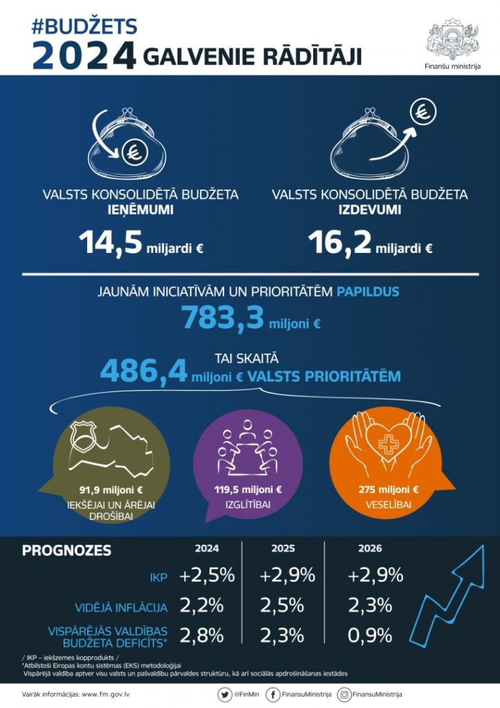 Valsts konsolidētā budžeta ieņēmumi nākamgad plānoti 14,5 miljardu eiro, izdevumi – 16,2 miljardu eiro apmērā (1)
