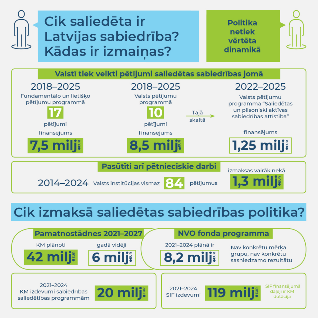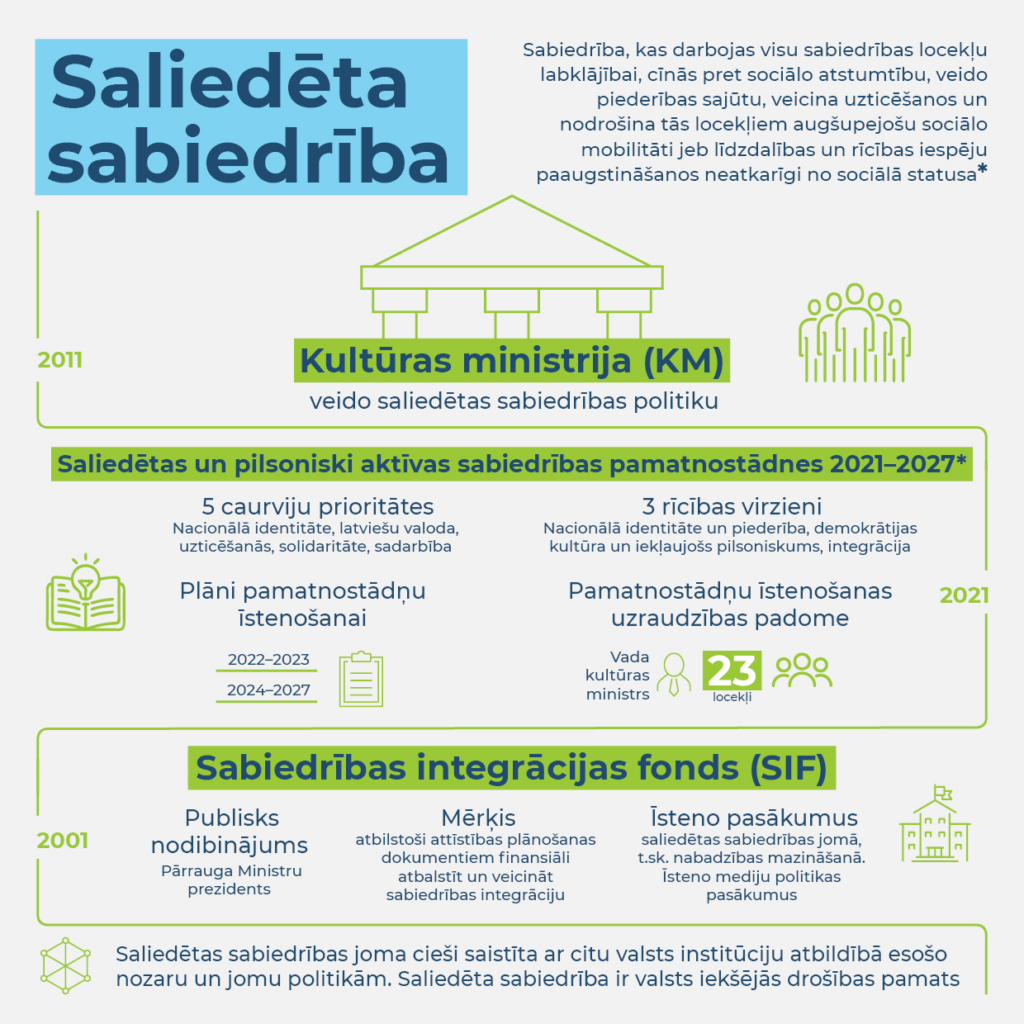 Latvijā par saliedētas sabiedrības jomas politiku no 2011. gada atbildīga ir KM. Valdība ir apstiprinājusi Saliedētas un pilsoniski aktīvas sabiedrības attīstības pamatnostādnes 2021.–2027. gadam (Pamatnostādnes 2021–2027). No 2001. gada darbojas Sabiedrības integrācijas fonds (SIF) kam jāīsteno attīstības plānošanas dokumentiem atbilstoši pasākumi sabiedrības integrācijā. Vispārīgas, neskaidras politikas apstākļos SIF daļēji pilda arī politikas veidotāja lomu.  “Izveidojusies savdabīga situācija, ka politiķu iesaiste politikas īstenošanā ir aktīvāka nekā politikas veidošanā, jo SIF padomē darbojas Ministru prezidenta pārstāvis un pieci ministri,” norāda I. Vilka.