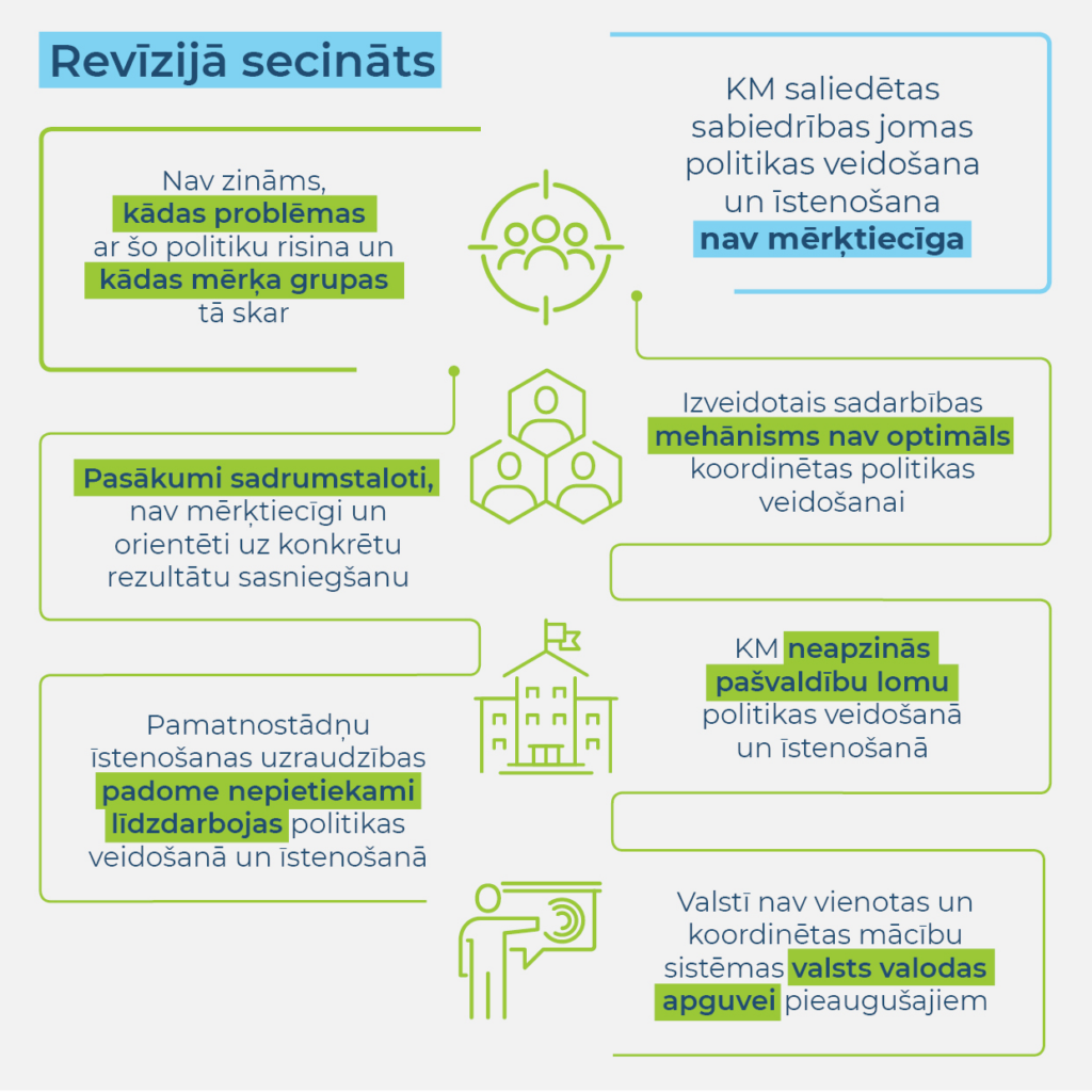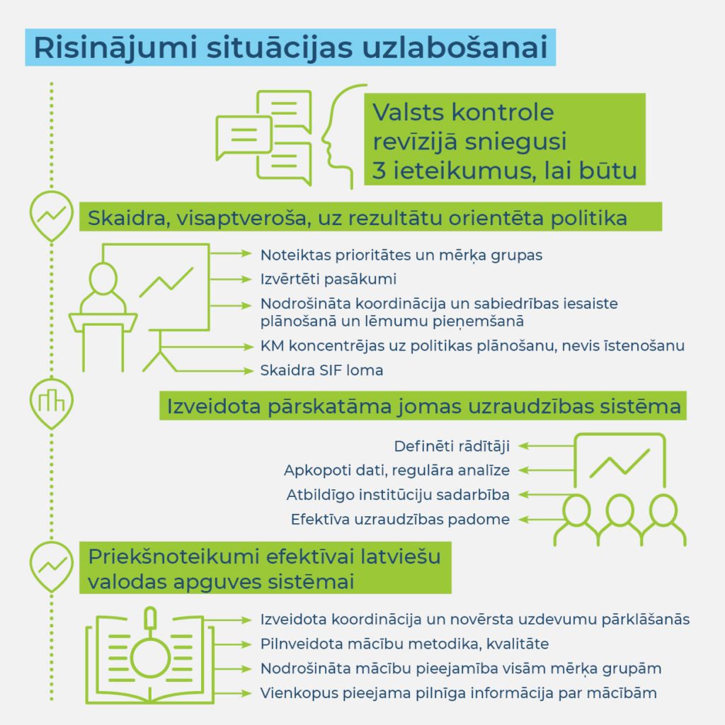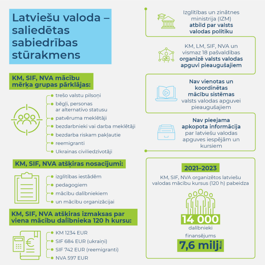 Latviešu valodas mācības pieaugušajiem ir būtiskas sabiedrības saliedētībai, taču mācību sistēma nav jēgpilni koordinēta. Mācības nesaskaņoti organizē Izglītības un zinātnes ministrija (IZM), KM, Labklājības ministrija (LM), SIF, Nodarbinātības valsts aģentūra, kā arī pašvaldības. Trūkst pilnīgu datu par mācību programmām, mērķa grupām, rezultātiem un finansējumu. Dažādās institūcijās noteiktie atšķirīgie nosacījumi rada nevienlīdzību un neskaidrību mācību dalībniekiem un izglītības iestādēm, turklāt bez centralizētas uzraudzības nevar novērtēt programmu efektivitāti. Valsts kontrole aicina ieviest vienotu stratēģiju un koordināciju, jo valodas apguve ir ne tikai izglītības, bet arī drošības, imigrācijas, nodarbinātības un integrācijas jautājums.