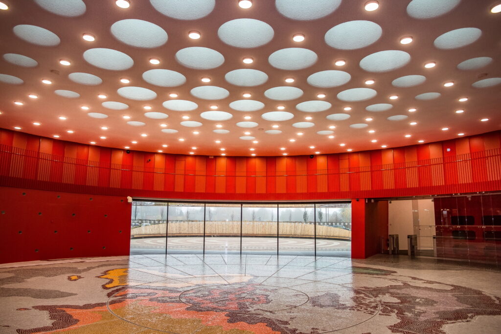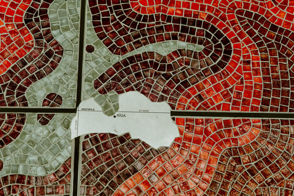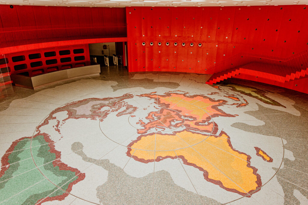 Zinātnes centrs “VIZIUM” pārsteidz savus apmeklētājus jau pašā foajē, kur apaļās telpas vidū izlikta mozaīka. Tā ir pasaules karte, kuras izveidei izmantots vairāk nekā 600 000 Murano stikla gabaliņu. Pasaules karte ir roku darbs, to salika speciālisti no Itālijas. Mozaīkas kartes centrā – maza Latvija un punkts, kur atrodas Ventspils. Tieši šajā vietā pirms diviem gadiem topošā zinātnes centra pamatos iemūrēja kapsulu ar vēstījumu nākamajām paaudzēm, vēsta portāls ventasbalss.lv.