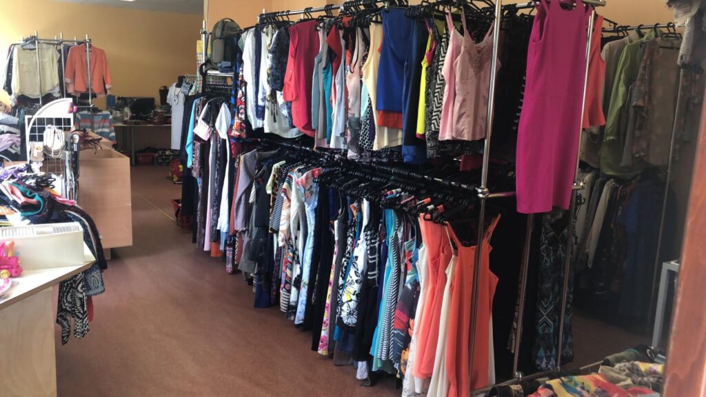 Dienas vidū lietoto apģērbu veikalā valda liela rosība, pircēji viens pēc otra nāk aplūkot preces.