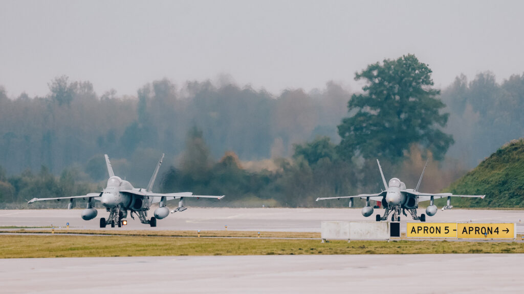 9. oktobrī, demonstrējot NATO klātbūtni reģionā, militārajā bāzē “Lielvārde” ieradās divi Kanādas Karalisko Gaisa spēku iznīcinātāji “CF-18”, apliecinot Kanādas ieguldījumu Latvijas un NATO austruma flanga drošībā. Kanādas iznīcinātāji “CF-18” Latvijā izvietoti Apvienoto reaģēšanas spēku mācību “TARASSIS” ietvaros. Foto: Armīns Janiks, Aizsardzības ministrija