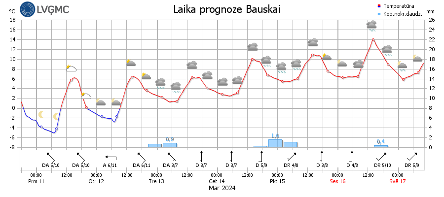 Rīgā caur mākoņiem izsprauksies kāds saules stars, nav gaidāmi ievērojami nokrišņi un vējš lēni līdz mēreni pūtīs no dienvidaustrumiem. Gaisa temperatūra paaugstināsies līdz +5 grādiem.