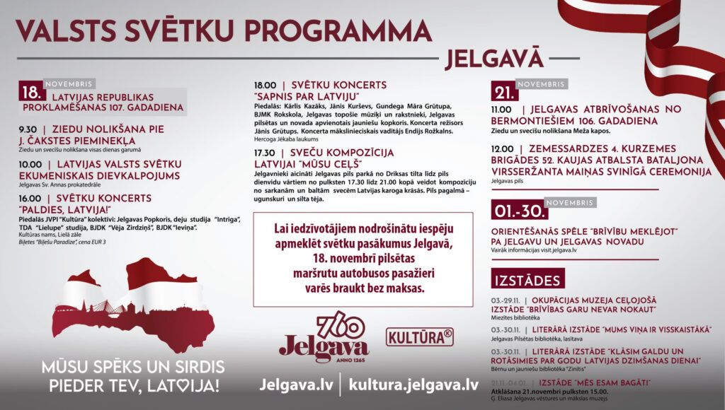 Jelgavā, svinot Latvijas 107. dzimšanas dienu, no plkst. 17.30 līdz 21 iedzīvotāji aicināti Jelgavas pils parkā veidot sveču kompozīciju Latvijai “Mūsu ceļš”. No Driksas tilta līdz pils dienvidu vārtiem kā jelgavnieku dāvana Latvijai svētkos kopīgi tiks veidots gaismas ceļš valsts karoga krāsās no sarkanām un baltām svecēm.