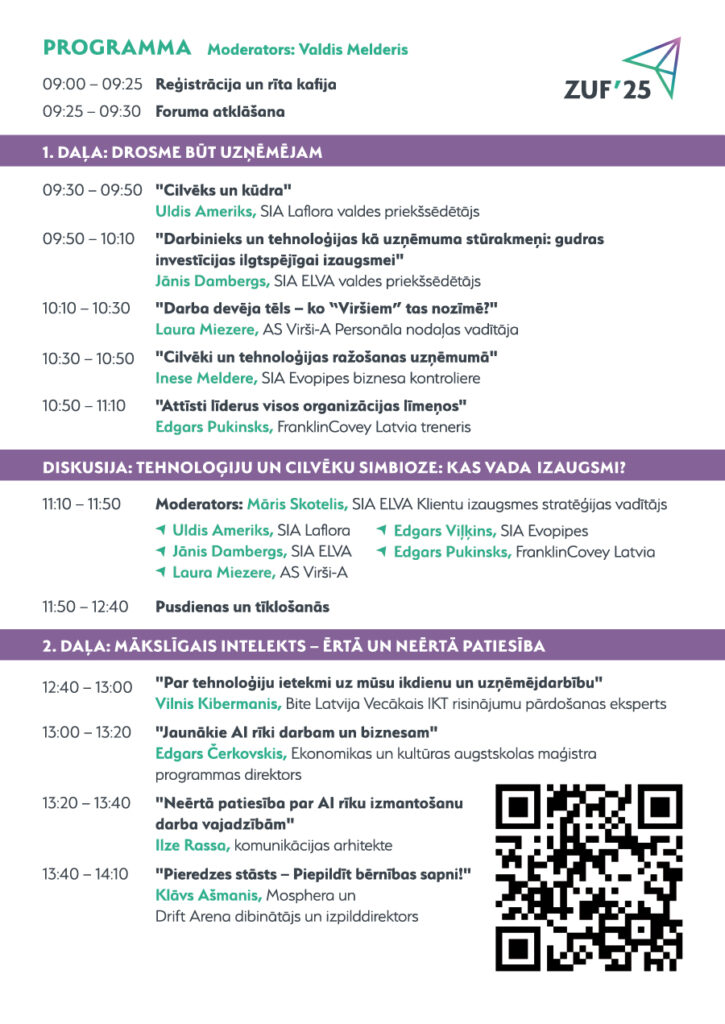 “Labs uzņēmējs pastāvīgi tur roku uz pulsa, seko līdzi inovācijām un iegulda sava uzņēmuma un darbinieku izaugsmē. Mākslīgais intelekts ir kļuvis par vienu no karstākajiem tematiem uzņēmējdarbībā un darbinieki neizbēgami meklē iespējas, kā strādāt gudrāk, atvieglot un uzlabot darba procesus, iekļaujot AI rīkus savā darba rutīnā, taču ap to joprojām virmo daudz mītu. Risinājumu ir ļoti daudz, kā neapjukt un atrast piemērotāko? Foruma ietvaros mēs vēlamies akcentēt, ka vispirms nepieciešama izpratne par pamatlietām un sagatavošanās pārmaiņām. Kā iet līdzi laikam, strādāt gudri un sasniegt vairāk, kā būt labākam vadītājam, kā sevī atrast un izkopt līdera potenciālu, kā neapstāties pie neveiksmēm, mācīties no citu kļūdām un pārņemt labo pieredzi – atbildes uz šiem jautājumiem meklēsim Zemgales uzņēmēju forumā jau šajā ceturtdienā,” aicina Jelgavas novada pašvaldības Tūrisma un uzņēmējdarbības nodaļas vadītāja Ilze Matusa.