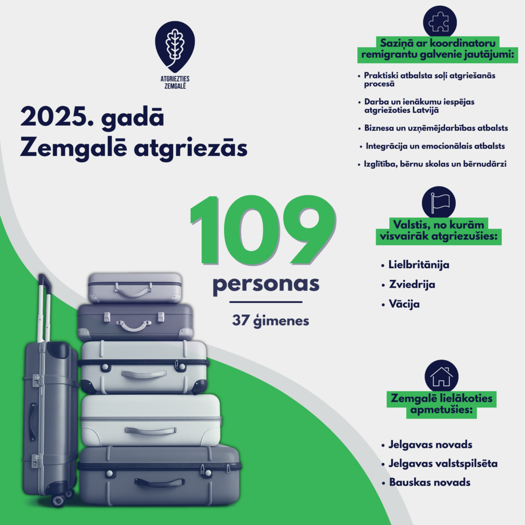 Zemgales plānošanas reģionā (ZPR) 2025. gadā ar remigrācijas koordinatora atbalstu uz dzīvi atgriezās 109 personas jeb 37 ģimenes, savukārt potenciālajiem remigrantiem tika sagatavoti 377 individuāli piedāvājumi, informē Undīne Šulca-Heistere, ZPR sabiedrisko attiecību speciāliste.