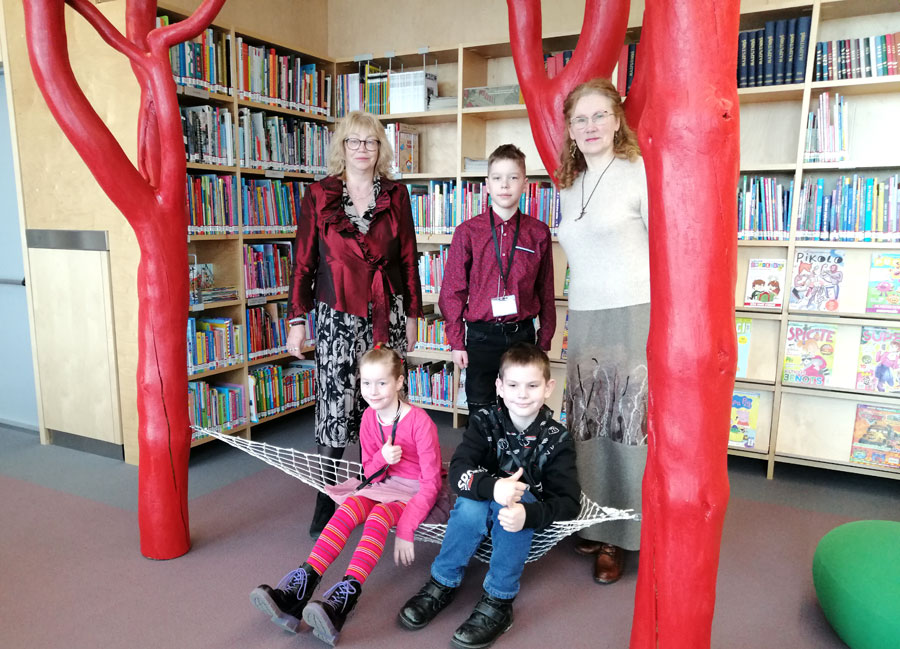 Foto – Zemgales lasīšanas vēstnese Iveta Slavīte (no labās) kopā ar Bauskas bērnu bērnu bibliotēkas čaklajiem lasītājiem un bibliotēkāri Sarmīti Freimani. Foto no Bauskas bērnu bibliotēkas arhīva.