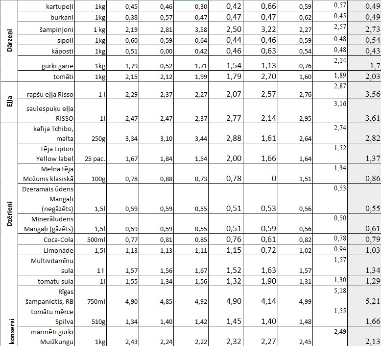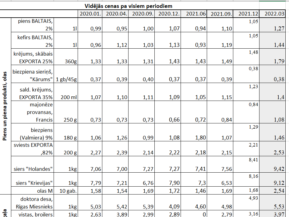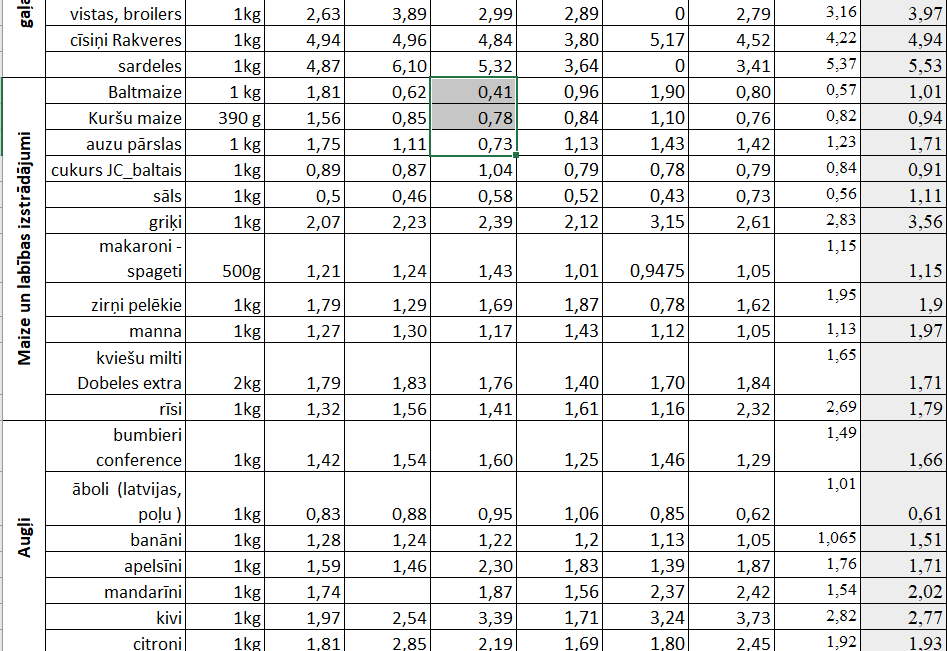 Maize un labības izstrādājumi. Vidējā cena baltmaizei šī gada martā bija 1,01 eiro, 2021. decembrī tā bija 0,57 eiro, sadārdzinājums par 77%. Rupjmaizei cena ir pieaugusi daudz mazāk – par 14%. Auzu pārslu vidējā cena pieaugusi par 39%, griķi tagad maksā par 25% dārgāk. Samazinājusies rīsu cena, un tagad par kilogramu jāmaksā 1,79 eiro, kamēr decembrī -2,69 eiro. Arī makaroni un zirņi kļuvuši lētāki.