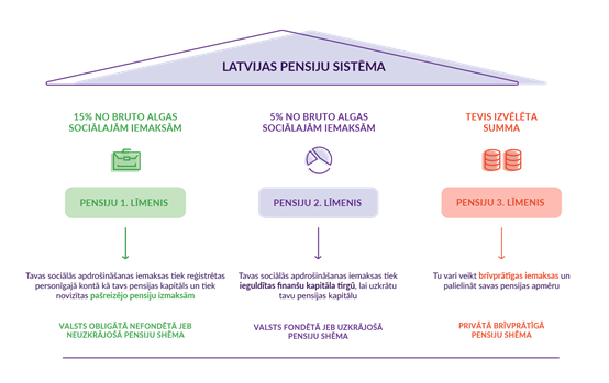 Latvijā ir izveidota un darbojas trīs līmeņu pensiju sistēma: