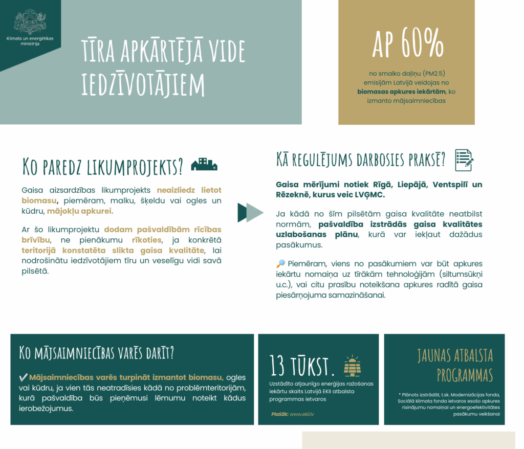 Sabiedrībā valda diskusijas un zināms satraukums par izstrādāto “Gaisa aizsardzības likumu”, taču praktiski regulējums neaizliedz lietot biomasu (piemēram, malku, granula, šķeldu), ogles vai kūdru mājokļu apkurei.