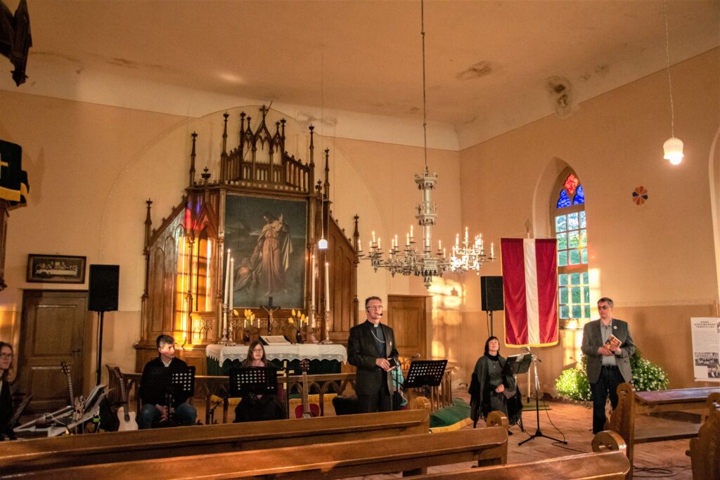 «Baznīcu nakts» Budbergas baznīcā; mācītājs Juris Morics – centrā. Foto no “Bauskas Dzīves” arhīva.