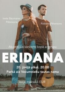 Parkā aiz Vecumnieku tautas nama 20. jūnijā plkst. 20 akustiskais koncerts kopā ar grupu «Eridana».