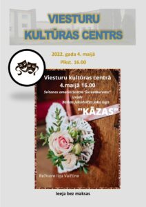 Viesturu kultūras centrā 4. maijā plkst. 16 Svitenes amatierteātra «Šurumburums» joku luga «Kāzas». Režisore Ilga Vaičūne.