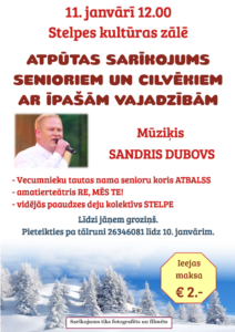 Stelpes kultūras zālē 11. janvārī plkst. 12 atpūtas sarīkojums senioriem un cilvēkiem ar īpašām vajadzībām.