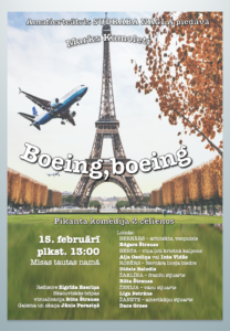 Misas tautas namā 15. februārī plkst. 13 Baldones amatierteātra «Sudraba nagla» izrāde – Marks Kamoleti «Boeing, boeing».