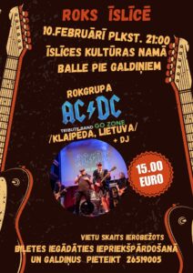 Īslīces kultūras namā 10. februārī plkst. 21 balle pie galdiņiem. Spēlē rokgrupa «AC DC» no Klaipēdas.