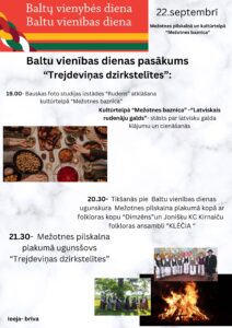 plkst. 20.30 tikšanās pie Baltu vienības dienas ugunskura Mežotnes pilskalna plakumā kopā ar folkloras kopu «Dimzēns» un Jonišķu KC Kirnaiču folkloras ansambli «Klečia»;