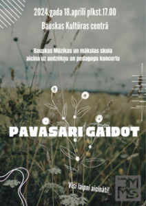 Bauskas kultūras centrā 18. aprīlī plkst. 17 Bauskas mūzikas un mākslas skola aicina uz audzēkņu un pedagogu koncertu «Pavasari gaidot».