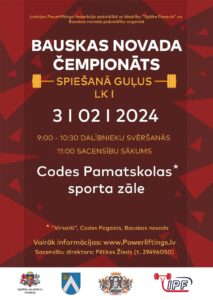 Codes pamatskolas sporta zālē 3. februārī plkst. 11 Bauskas novada čempionāts svara spiešanā guļus.