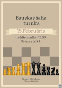 Bauskā, Uzvaras ielā 4, 15. februārtī plkst. 15 Bauskas šaha turnīrs.