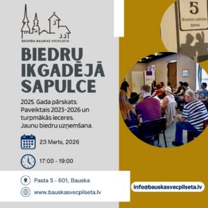 Bauskā, Pasta ielā 5, 23. martā plkst. 17 biedrības «Bauskas vecpilsēta» ikgadējā kopsapulce – 2025. gada pārskats; paveiktais 2023. – 2026. gadā, jaunu biedru uzņemšana.