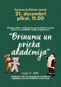 Iecavas kultūras namā 21. decembrī plkst. 11 «Brīnumu un prieka akadēmija» – muzikāla rotaļu programma pirmsskolas vecuma bērniem..