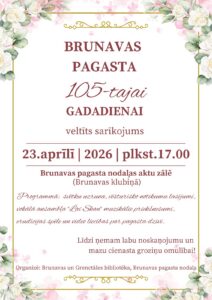 Brunavas pagasta nodaļas aktu zālē 23. aprīlī plkst. 17 Brunavas pagasta 105-tajai gadadienai veltīts sarīkojums: svētku uzruna, vēsturisko notikumu lasījumi, vokālā ansambļa «lai skan» muzikālie priekšnesumi, erudīcijas spēle un video liecības par pagasta dzīvi.