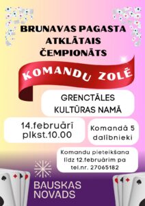 Grenctāles kultūras namā 14. februārī plkst. 10 Brunavas pagasta atklātais čempionāts komandu zolītē.
