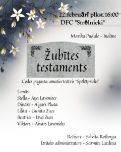Daudzfunkcionālajā centrā «Strēlnieki» 22. februārī plkst. 16 Codes amatierteātra «Spēlētprieks» izrāde «Žubītes testaments».