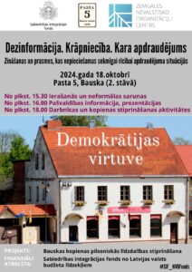 Bauskas kopienas centrā Bauskā, Pasta ielā 5, 18. oktobrī no plkst. 15.30 «Demokrātijas virtuve» – Dezinformācija. Krāpniecība. Kara apdraudējums. Zināšanas, kas nepieciešamas sekmīgai rīcībai apdraudēšanas situācijās.