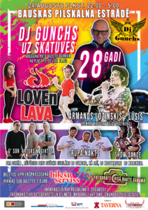 Bauskas pilskalna estrādē 24. augustā plkst. 22 – DJ Gunchs ar pasākumu – 28 gadi uz skatuves.