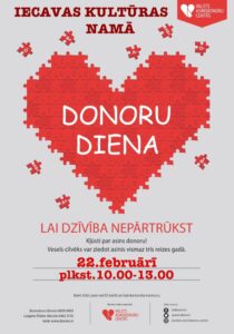 Iecavas kultūras namā 22. februārī 22. februārī no plkst. 10 līdz 13 donoru diena.