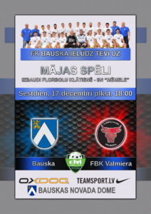 » 17. decembrī plkst. 18 «Elvi» florbola līga vīriešiem Bauska – FBK «Valmiera».