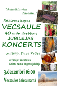 Vecsaules saietu namā 3. decembrī plkst. 16 folkloras kopas «Vecsaule» 40 gadu darbības jubilejas koncerts.
