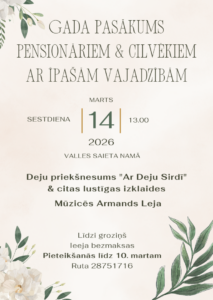 Valles saieta namā 14. martā plkst. 13 Gada pasākums pensionāriem un cilvēkiem ar īpašām vajadzībām.