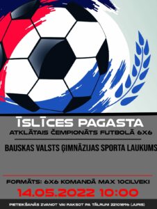 Bauskas Valsts ģimnāzijas sporta laukumā 14. maijā plkst. 10 Īslīces pagasta atklātais čempionāts futbolā 6×6.