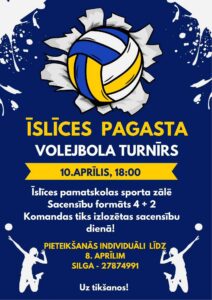 Īslīces pamatskolas sporta zālē 10. aprīlī plkst. 18 Īslīces pagasta MIX volejbola turnīrs.