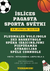 Rītausmās, Liepu ielā 1, 14. jūnijā plkst. 11 Īslīces pagasta sporta svētki.